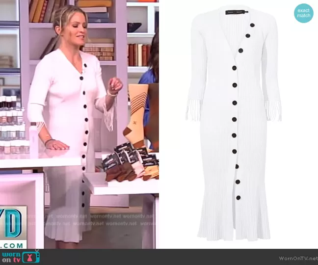 Sara Haines on The View on ABC was spotted wearing this Sara Haines’ white ribbed button down dress on The View on Jun 20 2024's episode. Sara's Dress is the Ribbed-knit Buttoned-up Dress by Proenza Schouler.