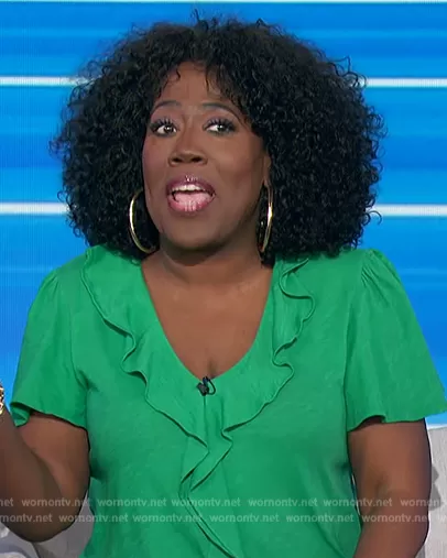 Sheryl Underwood on The Talk on CBS was spotted wearing this green ruffle front blouse on The Talk on May 05 2023's episode. Sheryl's Top is the Ruffle-Trim Slub Jersey T-Shirt by Ralph Lauren.