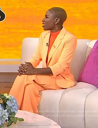 on Today on NBC was spotted wearing this orange ruched blazer and pants by Today on May 05 2023's episode. 's Blazer is the Ruched-Sleeve One-Button Blazer by DKNY . 's Pants is the High Rise Wide-Leg Pull-On Pants by DKNY.