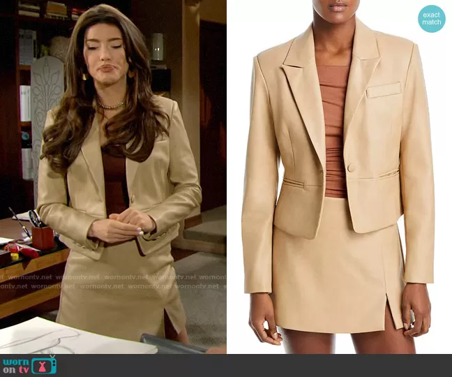 Steffy Forrester (played by Jacqueline MacInnes Wood) on The Bold and the Beautiful on CBS was spotted wearing this beige leather jacket and skirt set on The Bold and the Beautiful on May 05 2023's episode. Steffy's Jacket is the Shrunken Cropped Blazer in Bisque by Aqua . Steffy's Skirt is the Slit Hem Mini Skort in Bisque by Aqua .