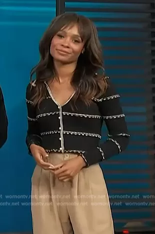 Zuri Hall on Access Hollywood on NBC was spotted wearing this black stripe cardigan on Access Hollywood on May 26 2023's episode. Zuri's Sweater is the Andina Textured Striped Cardigan by Sandro .