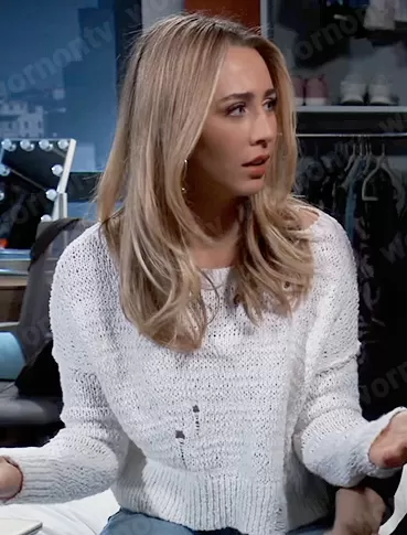 Josslyn Jacks (played by Eden McCoy) on General Hospital on ABC was spotted wearing this white cropped sweater on General Hospital on May 06 2023's episode. Josslyn's Sweater is the Cropped Distressed Sweater by Hollister .