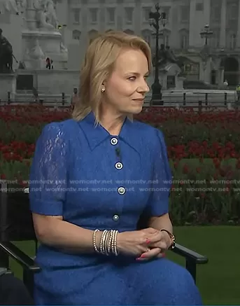on Today on NBC was spotted wearing this blue lace dress on Today on May 05 2023's episode. 's Dress is the Fatima Midi Lace Dress by Finery.