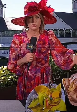 Dylan Dreyer on Today on NBC was spotted wearing this red floral wrap dress on Today on May 02 2024's episode. Dylan's Dress is the Floral Print Tiered Ruffle High-Low Dress by Eliza J.