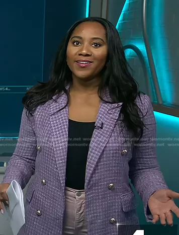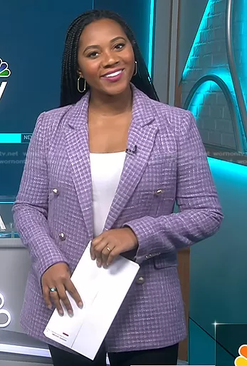 Kay Angrum on NBC News Daily on NBC was spotted wearing this purple plaid tweed blazer on NBC News Daily on Sep 21 2023's episode. Kay's Jacket is the Tweed Double Breasted Blazer by Aqua x Maeve Reilly.