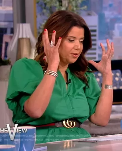 Ana Navarro on The View on ABC was spotted wearing this green puff sleeve dress on The View on May 08 2023's episode. Ana's Dress is the Laena Dress by Diane Von Furstenberg . Ana's Belt is the Nylon Double G Belt by Gucci.