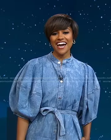 on Good Morning America on ABC was spotted wearing this puff sleeve denim dress on Good Morning America on May 08 2023's episode. 's Dress is the Puff Sleeve Crinkled Denim Shirtdress by Stella McCartney.