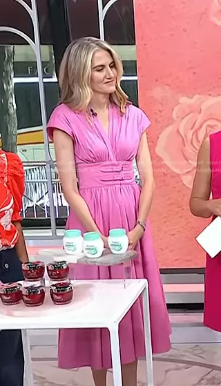 on Today on NBC was spotted wearing this pink double buckle belt dress on Today on May 08 2023's episode. 's Dress is the Jaden Midi-Dress by Alexis.