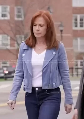 on NBC News Daily on NBC was spotted wearing this blue suede moto jacket on NBC News Daily on May 08 2023's episode. 's Jacket is the Morning Suede Moto Jacket by Blank NYC.