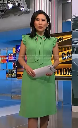 Vicky Nguyen on NBC News Daily on NBC was spotted wearing this Vicky’s green tie neck dress on NBC News Daily on Jun 17 2024's episode. Vicky's Dress is the Tie Neck Flutter Cap Sleeve A-Line Dress by Maggy London.