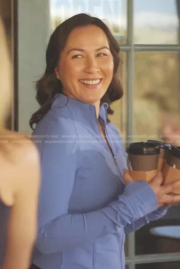 (played by ) on 9-1-1 on ABC was spotted wearing this blue active zip jacket on 9-1-1 on episode 'Love Is in the Air' (6x17) in May 2023. 's Jacket is the Cropped Define Jacket in Water Drop by lululemon.
