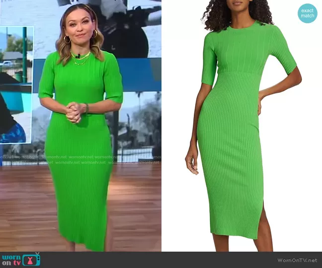 Eva Pilgrim on Good Morning America on ABC was spotted wearing this green ribbed knit dress on Good Morning America on Aug 03 2023's episode. Eva's Dress is the Mixed Rib Midi Sweater Dress by Frame . Eva's Shoes is the Tribute Leather Mules by Saint Laurent.