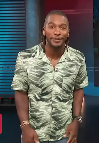 Scott Evans on Access Hollywood on NBC was spotted wearing this green wavy print shirt on Access Hollywood on May 09 2023's episode. Scott's Shirt is the Short Sleeve Storm Shirt by PS Paul Smith.