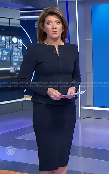 Norah O'Donnell on CBS Evening News on CBS was spotted wearing this navy peplum jacket on CBS Evening News on Aug 03 2023's episode. Norah's Jacket is the Crepe Knit Ruffle Jacket by Scanlan Theodore.