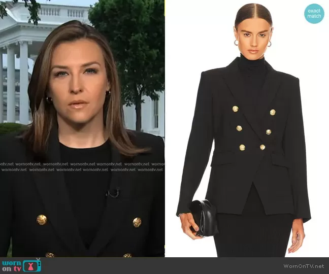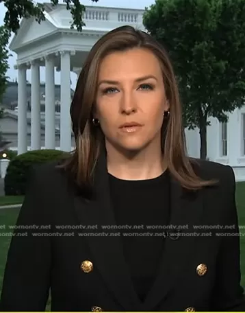 Mary Bruce on Good Morning America on ABC was spotted wearing this black blazer with gold buttons on Good Morning America on Jun 06 2024's episode. Mary's Jacket is the Miller Dickey Jacket in Black with Gold Buttons by Veronica Beard.