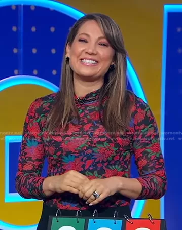 Ginger Zee on Good Morning America on ABC was spotted wearing this Ginger’s red and black floral top on Good Morning America on May 10 2023's episode. Ginger's Top is the Wallpaper Shaw Turtleneck by Rag & Bone.