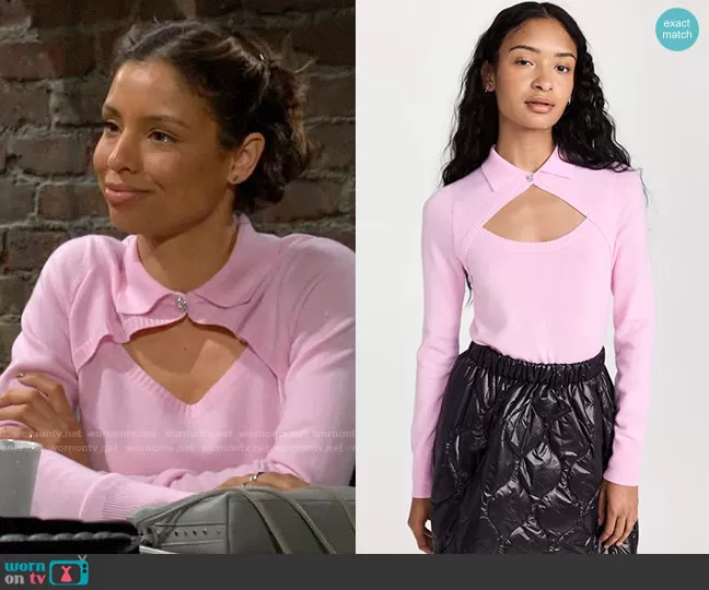 Elena Dawson (played by Brytni Sarpy) on The Young and the Restless on CBS was spotted wearing this pink collared cutout sweater on The Young and the Restless on May 10 2023's episode. Elena's Sweater is the Cut Away Cashmere Polo Sweater by Autumn Cashmere.