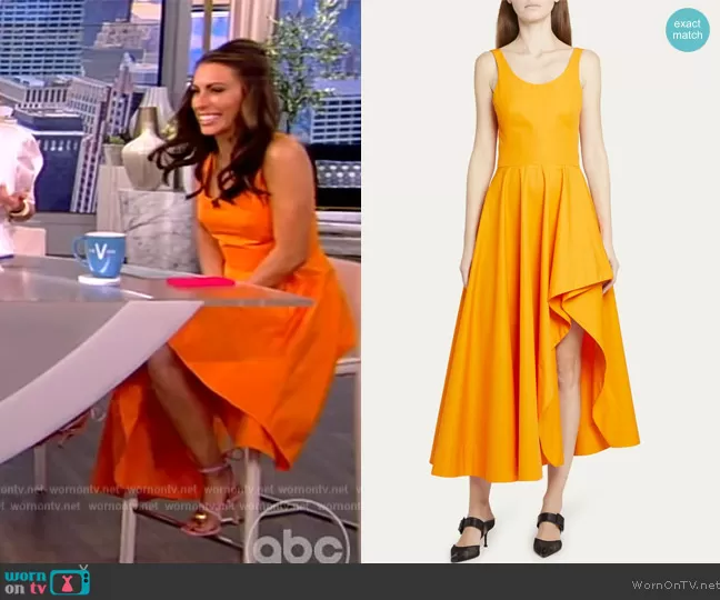 Alyssa Farah Griffin on The View on ABC was spotted wearing this orange asymmetric dress on The View on May 10 2023's episode. Alyssa's Dress is the Poplin Midi Dress with Asymmetric Ruffle Slit by Alexander McQueen.