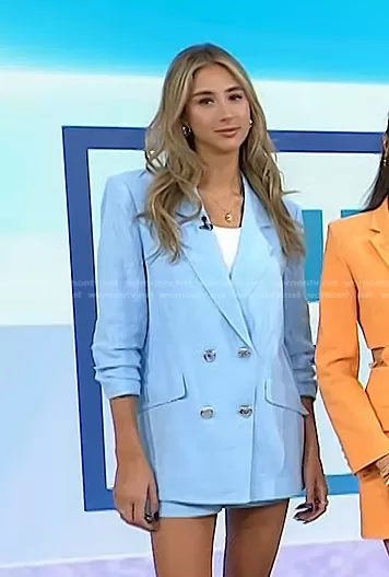 on Today on NBC was spotted wearing this blue double breasted blazer and shorts on Today on May 10 2023's episode. 's Jacket is the Gianni Double Breasted Blazer by Ramy Brook . 's Shorts is the Gleirys Belted Shorts by Ramy Brook.