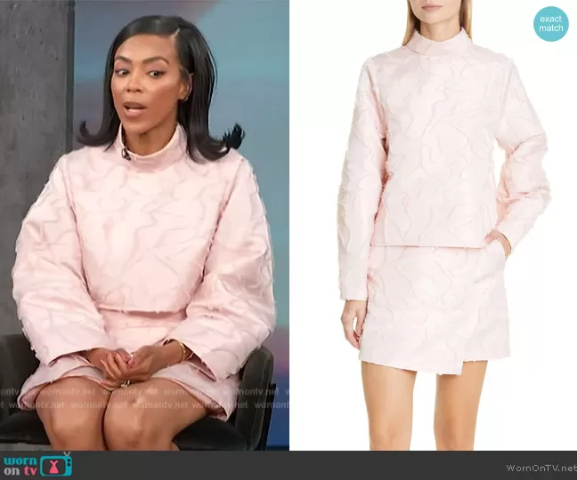 on Access Hollywood on NBC was spotted wearing this pink textured top and skirt on Access Hollywood on Jun 19 2023's episode. 's Top is the Cheche Textured Pattern Top by Stine Goya . 's Skirt is the Silje Textured Wrap Miniskirt by Stine Goya.