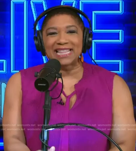 Deja Vu on Live with Kelly and Mark on Disney ABC Home Entertainment was spotted wearing this purple tie neck dress on Live with Kelly and Mark on Aug 01 2023's episode. Deja Vu's Dress is the Pleated Tie-Neck Dress by DKNY.