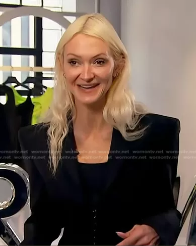 on Access Hollywood on NBC was spotted wearing this black corset blazer on Access Hollywood on May 10 2023's episode. 's Corset is the Mesh-paneled Corset Top by Mugler x H&M . 's Jacket is the Corset-Style Wool Jacket by Mugler x H&M . 's Pants is the Jersey Cut-out Pants by Mugler x H&M.