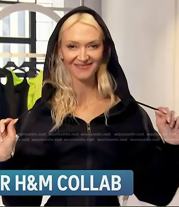 on Access Hollywood on NBC was spotted wearing this black corset hoodie on Access Hollywood on May 10 2023's episode. 's Sweater is the Corset-waist Hooded Jacket by Mugler x H&M.