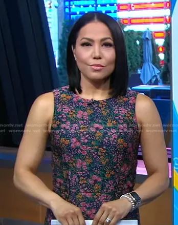 Stephanie Ramos on Good Morning America on ABC was spotted wearing this green floral sleeveless dress on Good Morning America on May 11 2023's episode. Stephanie's Dress is the Botanic Jacquard Sheath Dress by J. Crew.