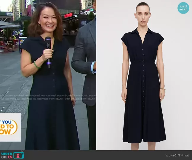 Eva Pilgrim on Good Morning America on ABC was spotted wearing this navy short sleeve shirtdress on Good Morning America on May 11 2023's episode. Eva's Dress is the Crepe Knit Shirt Dress by Scanlan Theodore.