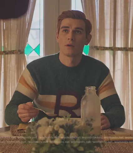 Archie Andrews (played by K.J. Apa) on Riverdale on The CW was spotted wearing this green stripe sweater on Riverdale on episode 'The Crucible' (7x13) in Jun 2023. Archie's Sweater is the Sweater with Clashing Detail by Benetton.