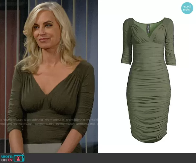 Ashley Abbott (played by Eileen Davidson) on The Young and the Restless on CBS was spotted wearing this green ruched dress on The Young and the Restless on May 11 2023's episode. Ashley's Dress is the Tara Dress by Norma Kamali .