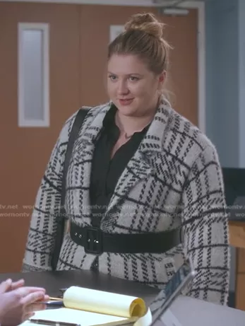 Taryn Helm (played by Jaicy Elliot) on Greys Anatomy on ABC was spotted wearing this white plaid wrap coat on Greys Anatomy on episode 'Ready to Run' (19x18) in May 2023. 's Coat is the Stirling Sweater Coat by L*Space.