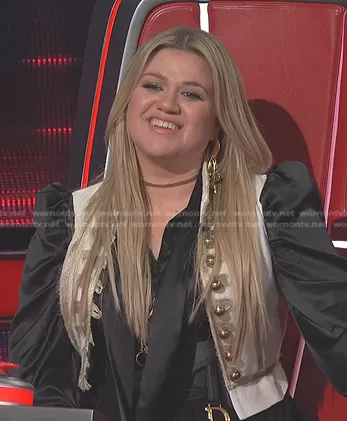 on The Voice on NBC was spotted wearing this black blouse and white military vest on The Voice on Apr 21 2023's episode. 's Top is the Mythical Blouse by The Vampire's Wife . 's Vest is the Gold Detail Vest by Zara.