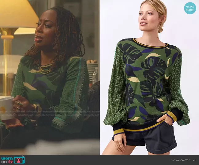 Malika Williams (played by Zuri Adele) on Good Trouble on Freeform was spotted wearing this green printed eyelet-sleeve sweater on Good Trouble on episode 'Tell Me Sweet Little Lies' (5x09) in May 2023. Malika's Sweater is the Contrast Eyelet Pullover by Bl-nk.