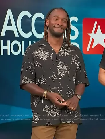 Scott Evans on Access Hollywood on NBC was spotted wearing this black floral shirt on Access Hollywood on Jul 04 2023's episode. Scott's Shirt is the Eren Short Sleeve Calligraphy Print Shirt by Officine Generale.