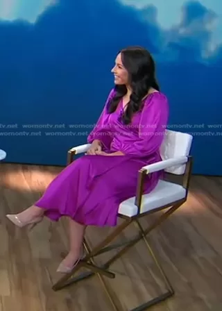on Good Morning America on ABC was spotted wearing this purple wrap dress on Good Morning America on May 12 2023's episode. 's Dress is the Satin Wrap Dress by Ann Taylor.