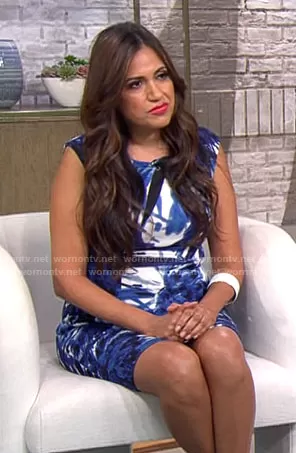 on CBS Mornings on CBS was spotted wearing this blue abstract print dress on CBS Mornings on May 15 2023's episode. 's Dress is the Floral Sleeveless Dress .