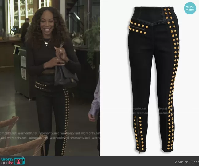 Sanya Richards-Ross on The Real Housewives of Atlanta on Bravo was spotted wearing this black studded jeans on The Real Housewives of Atlanta on episode 'Sisters Before Misters' (15x02) in May 2023. Sanya's Pants is the Button-embellished high-rise skinny jeans by Gucci.