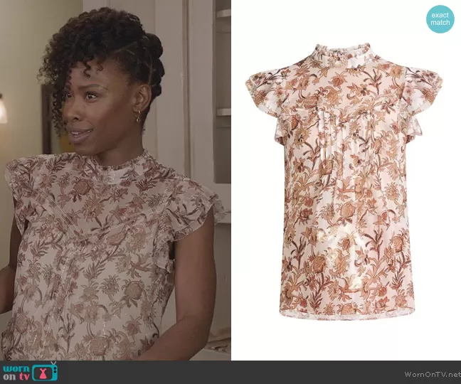 Olivia Baker (played by Samantha Logan) on All American on CWTV was spotted wearing this floral print flutter sleeve top on All American on episode 'Sabotage' (5x19) in May 2023. Olivia's Top is the Luciana Floral Print Top by Veronica Beard.