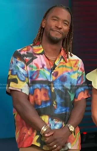 Scott Evans on Access Hollywood on NBC was spotted wearing this abstract print shirt on Access Hollywood on May 18 2023's episode. Scott's Shirt is the Landscape Daylight Print Camp Shirt by Our Legacy.