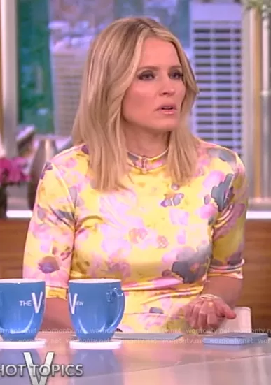 Sara Haines on The View on ABC was spotted wearing this yellow floral print dress on The View on May 16 2023's episode. Sara's Dress is the Asymmetric floral-print dress by Stella McCartney.
