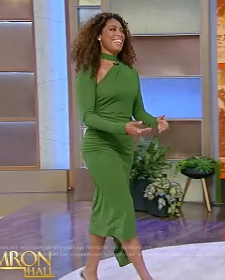 on Tamron Hall Show on ABC was spotted wearing this Gina Torres’ green asymmetric slash neck dress on Tamron Hall Show on May 16 2023's episode. 's Dress is the Asymmetric Ruched Midi Dress by Victoria Beckham.