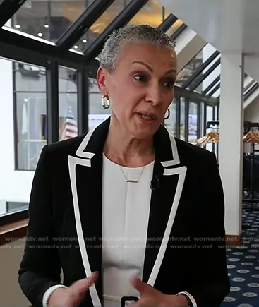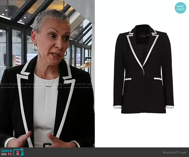 on Today on NBC was spotted wearing this black contrast trim blazer on Today on May 17 2023's episode. 's Jacket is the Breann Piped Fitted Blazer by Alice + Olivia.