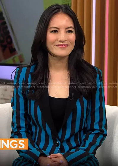 on CBS Mornings on CBS was spotted wearing this blue striped suit on CBS Mornings on May 18 2023's episode. 's Jacket is the Breann Stripe Blazer by Alice + Olivia . 's Pants is the Striped Bootcut Pants by Alice + Olivia.