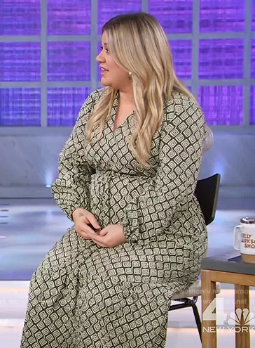 Kelly Clarkson on The Kelly Clarkson Show on NBC was spotted wearing this green geometric print shirtdress on The Kelly Clarkson Show on May 18 2023's episode. Kelly's Dress is the Geometric Print Dress by Zara.
