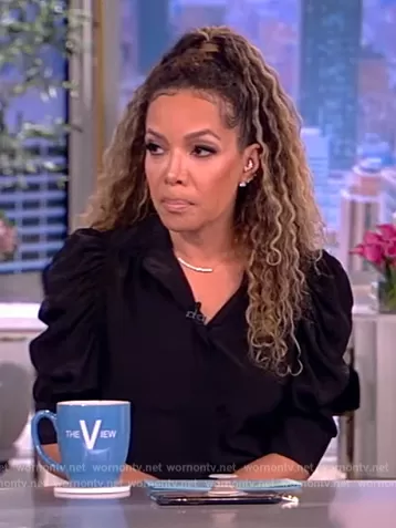 Sunny Hostin on The View on ABC was spotted wearing this black puff sleeve top and skirt on The View on May 18 2023's episode. Sunny's Top is the Frankie Henley by Frame