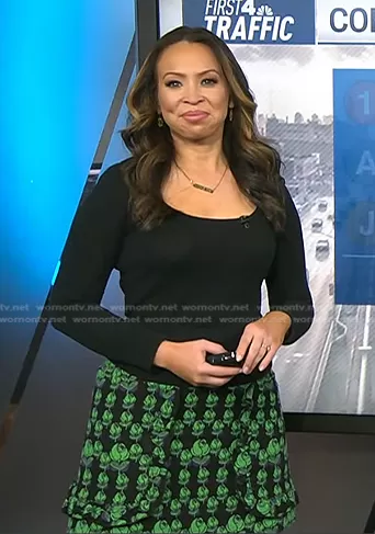Adelle Caballero on Today on NBC was spotted wearing this black and green floral skirt on Today on May 18 2023's episode. Adelle's Skirt is the Mod Rosette Skirt by Anna Sui.