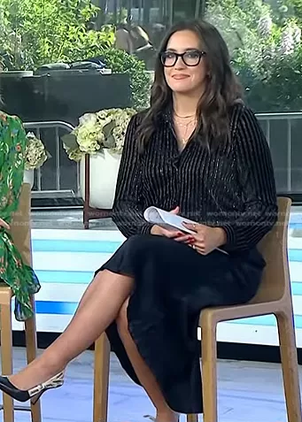 Savannah Sellers on Today on NBC was spotted wearing this metallic stripe shirt on Today on May 18 2023's episode. Savannah S's Top is the Laurent Velvet Metallic Stripe Blouse by L'Agence . Savannah S's Shoes is the J'adior Slingback Pumps in Black by Christian Dior .