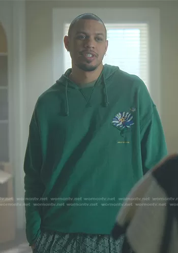 Isaac Hall (played by Sarunas J. Jackson) on Good Trouble on Freeform was spotted wearing this green hoodie on Good Trouble on episode 'Opening Night' (5x10) in May 2023. 's Sweater is the Embroidered Artwork Organic Cotton Hoodie by Scotch & Soda . 's Pants is the Printed Track Pants by Lacoste.