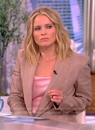 Sara Haines on The View on ABC was spotted wearing this beige check print blazer on The View on May 19 2023's episode. Sara's Blazer is the Donovan Linen Blend Blazer by A.L.C. . Sara's Pants is the Fynn Plaid High Waist Linen Blend Trousers by A.L.C..